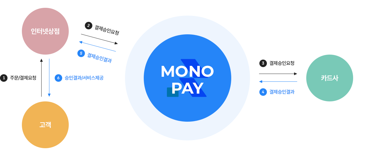 모노페이의 전자결제는 상점(가맹점)은 각각의 신용카드사 및 은행 등과의 번거로운 절차가 필요없고